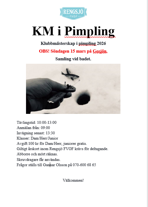 OBS Byte av sjö – Klubbmästerskap i pimpling 15 mars